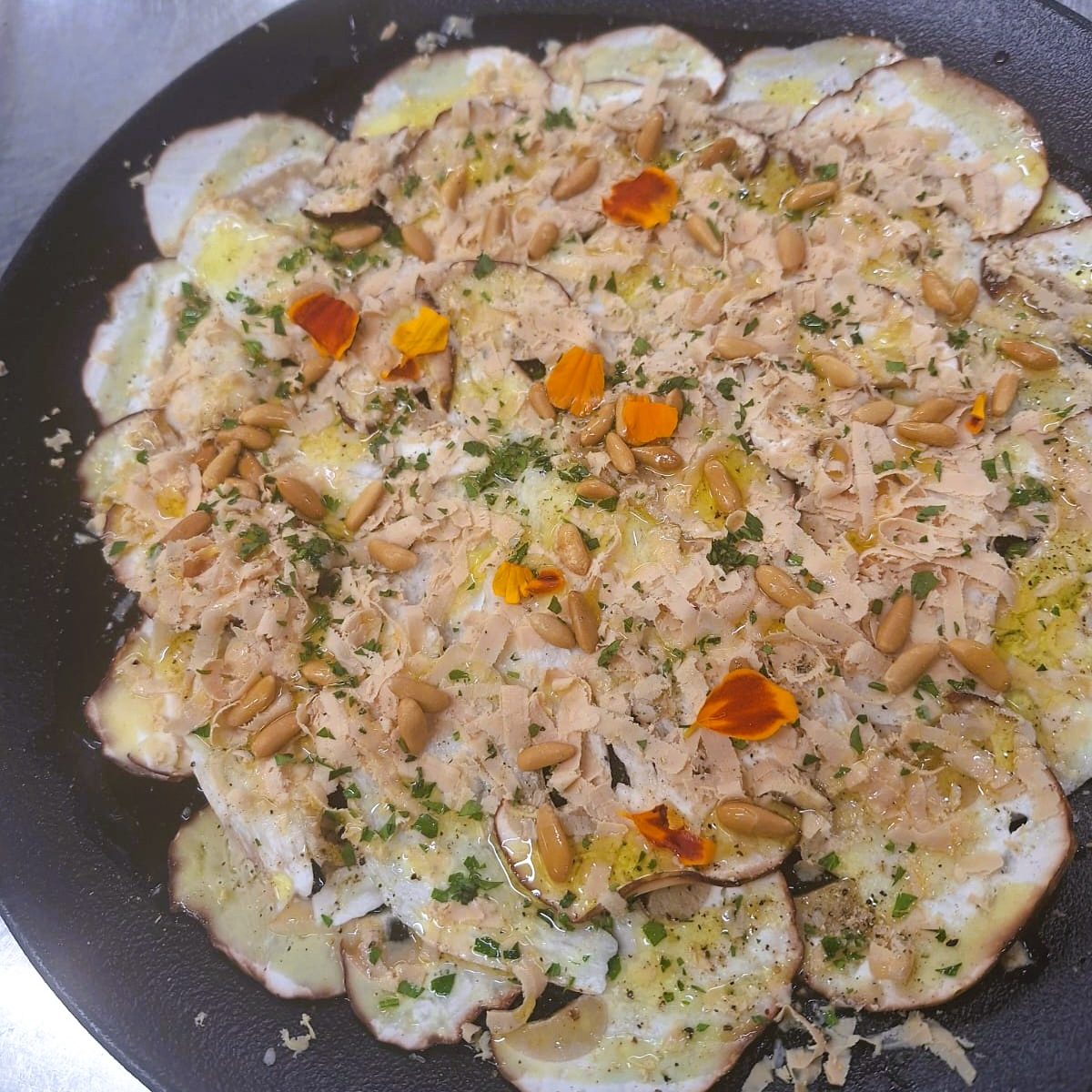 Avui us presentem una creació que combina tradició i sofisticació: Carpaccio de ceps amb foie i pinyons de proximitat, amanit amb oli d’oliva verge de primera premsada i un subtil toc de tòfona negra. 🥢